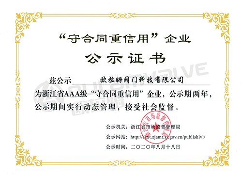 浙江省AAA級守合同重信用企業證書